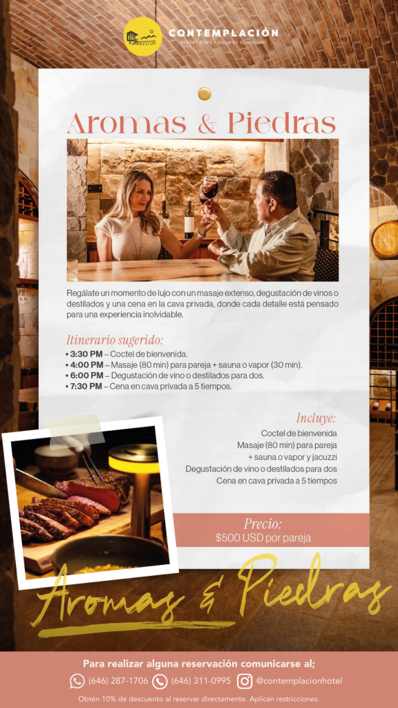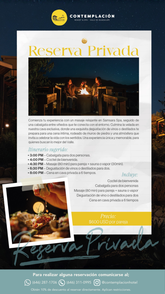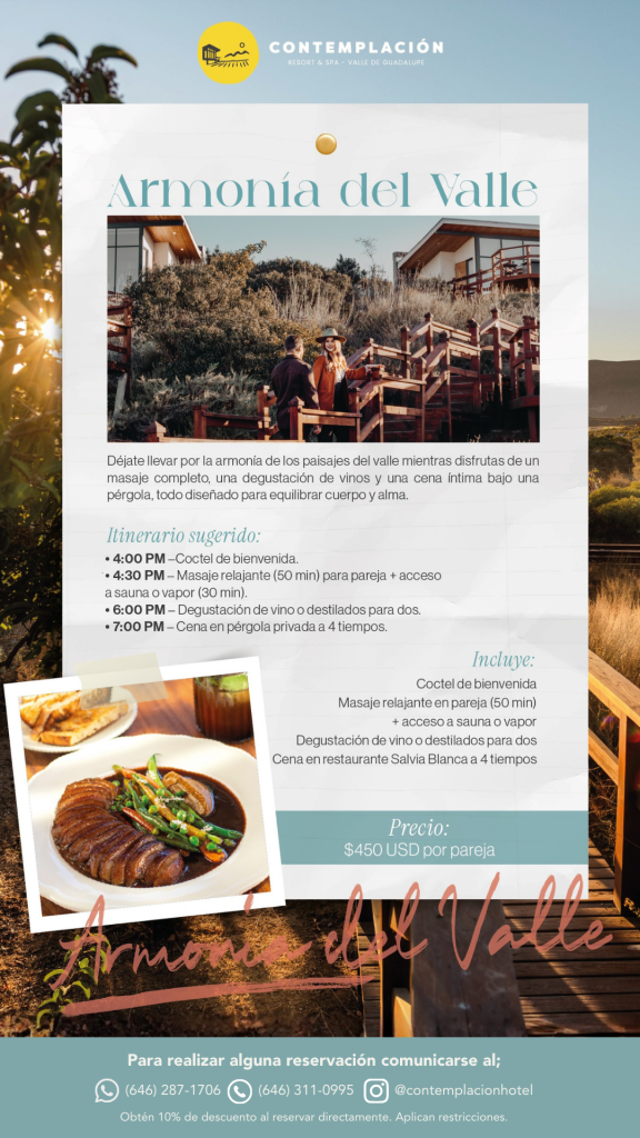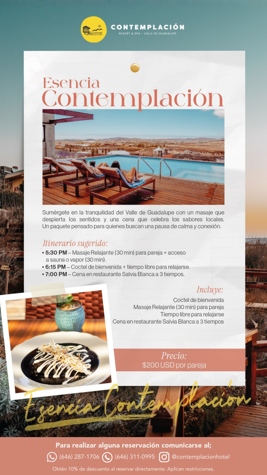 Sumérgete en la tranquilidad del Valle de Guadalupe con un masaje que despierta los sentidos y una cena que celebra los sabores locales. Un paquete pensado para quienes buscan una pausa de calma y conexión
