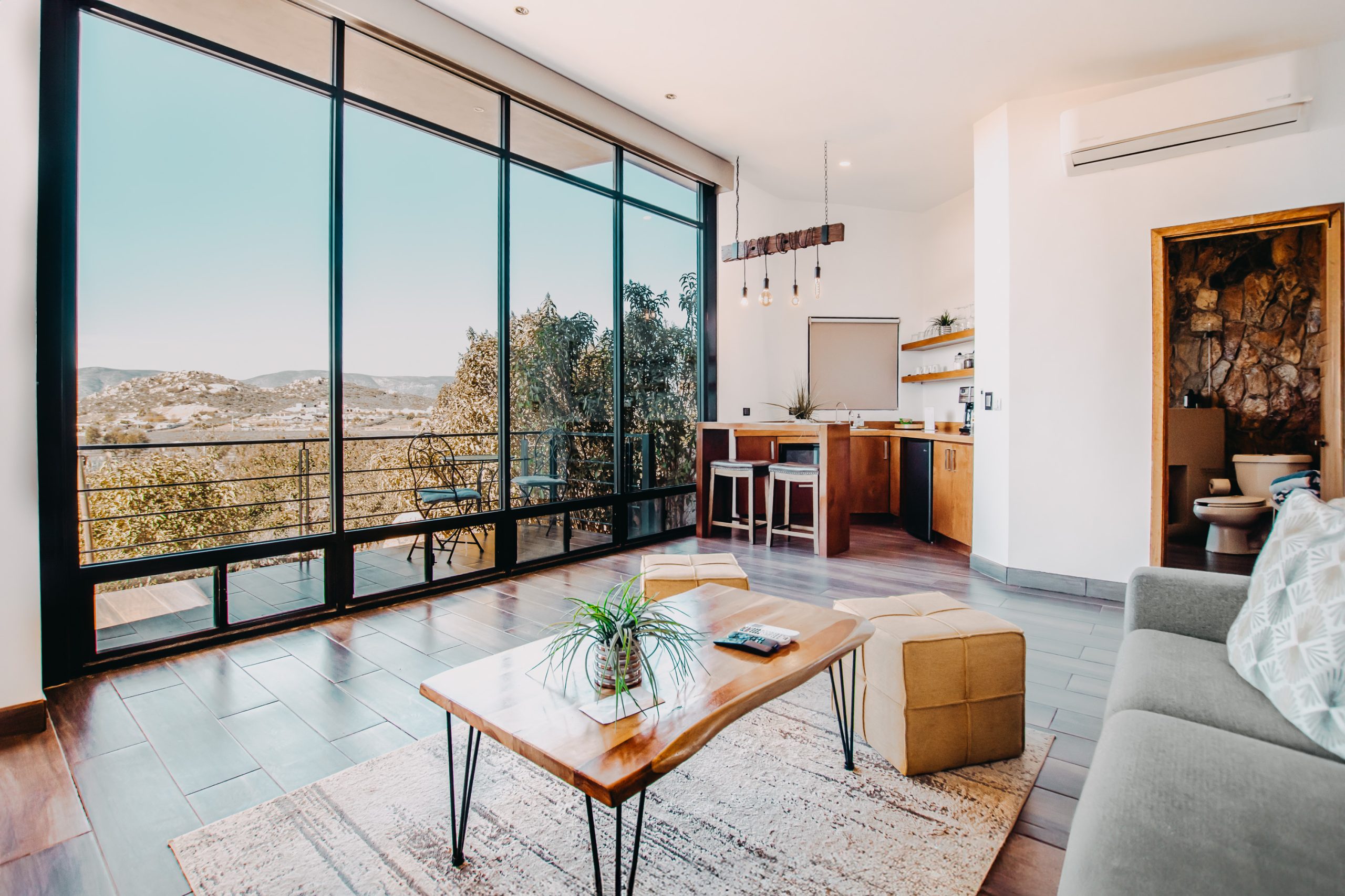 Vista a las montañas · No fumar · Aire Acondicionado · Batas · Área de estar · WIFI · Balcón con terraza · Sala de patio privada y fogatero · 1 Baño con regadera · Amenidades de baño · Cortina eléctrica Black out · 1 Cuarto individual · Sillón Cama para 2 personas · Silla hamaca · Sala · Frigobar · Microondas · Barra · Cafetera